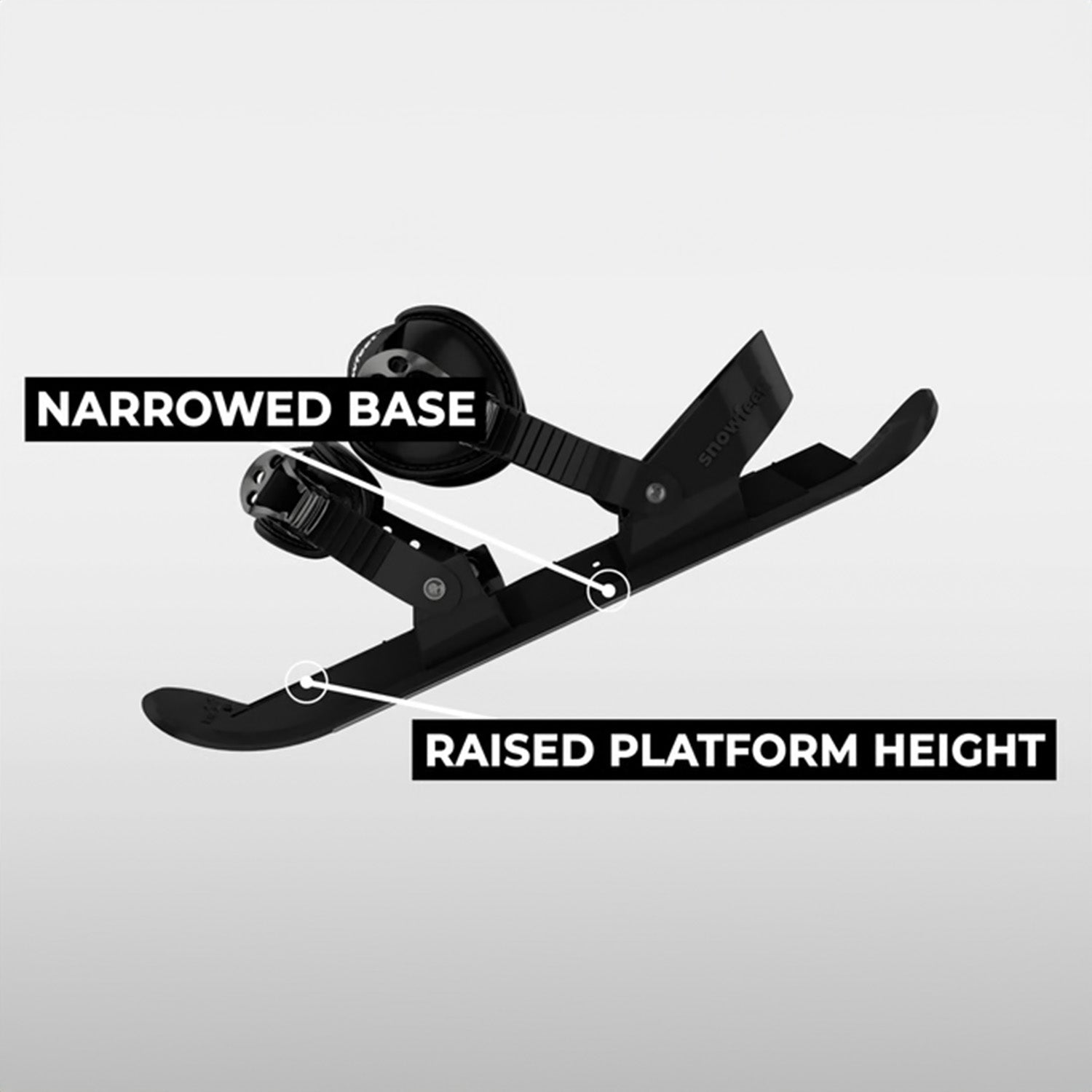 Les principales différences entre Snowfeet et Snowfeet PRO résident dans le design et les fonctionnalités. Snowfeet PRO est un peu plus long, offrant un équilibre entre le ski et le patinage. La longueur prolongée aide à l'atterrissage dans les snowparks. La version PRO a également une spatule et un talon plus hauts, une base rétrécie et une hauteur de plateforme augmentée, ce qui facilite l'initiation des virages et l'exécution des mouvements de carving.