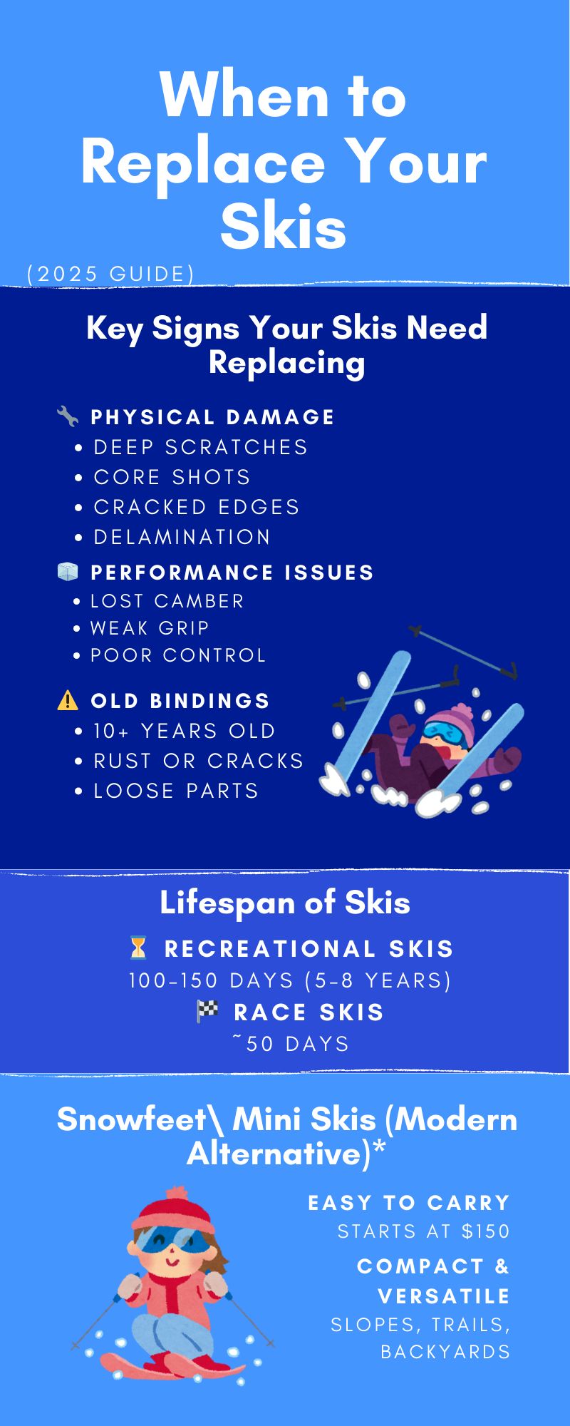 Osäker på om dina skidor är för gamla och osäkra att använda? ❄️ Här är en snabb genomgång av de viktigaste tecknen på att dina skidor behöver bytas ut, hur länge de egentligen håller, när bindningarna blir farliga och varför Snowfeet* mini skis kan vara en smartare, lättare uppgradering. ⛷️✨