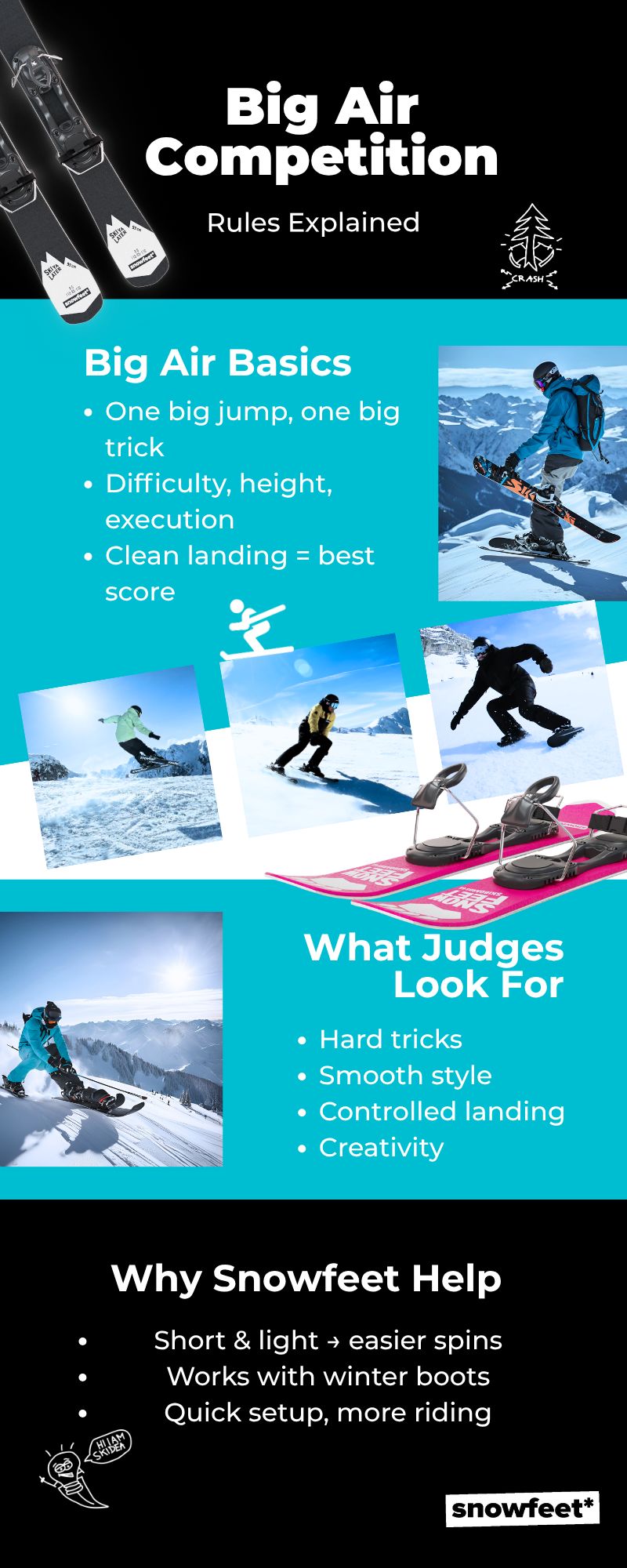 Big Air 現已成為奧運項目,重點是完成巨大跳躍與技巧。選手從大型跳台起跳,完成單一空中動作,並力求打動評審。重點如下: